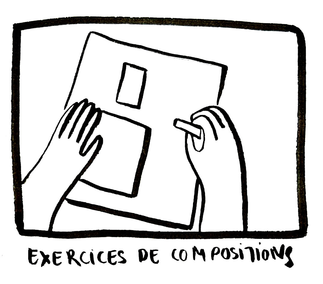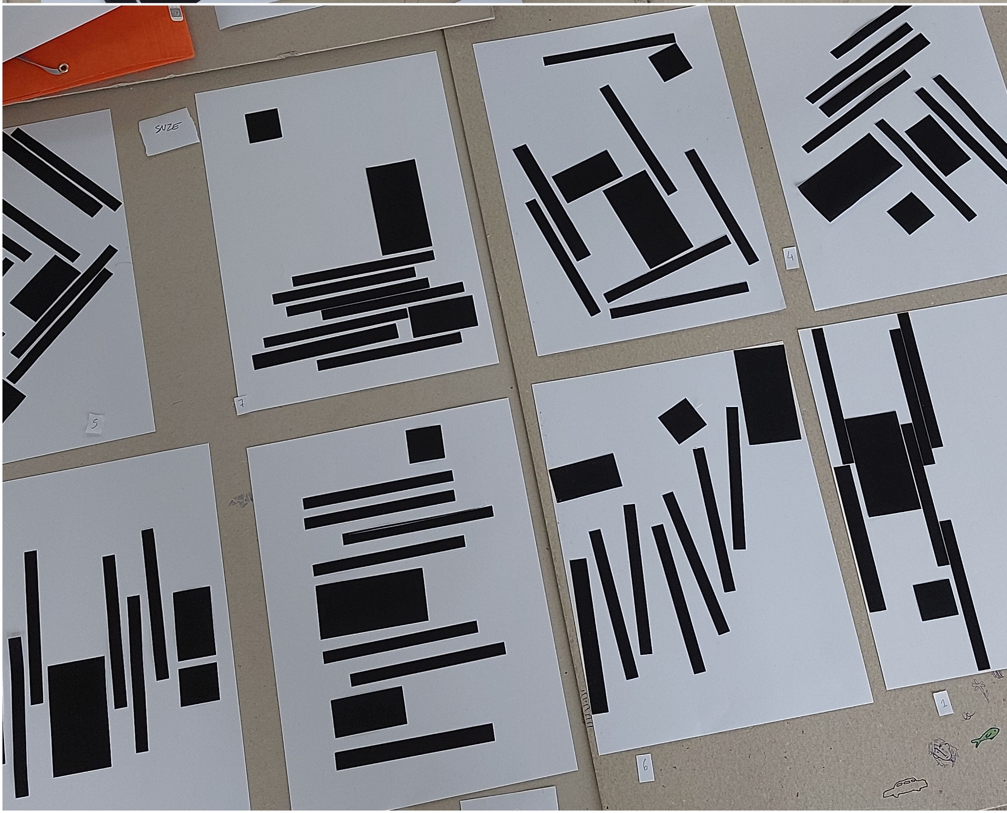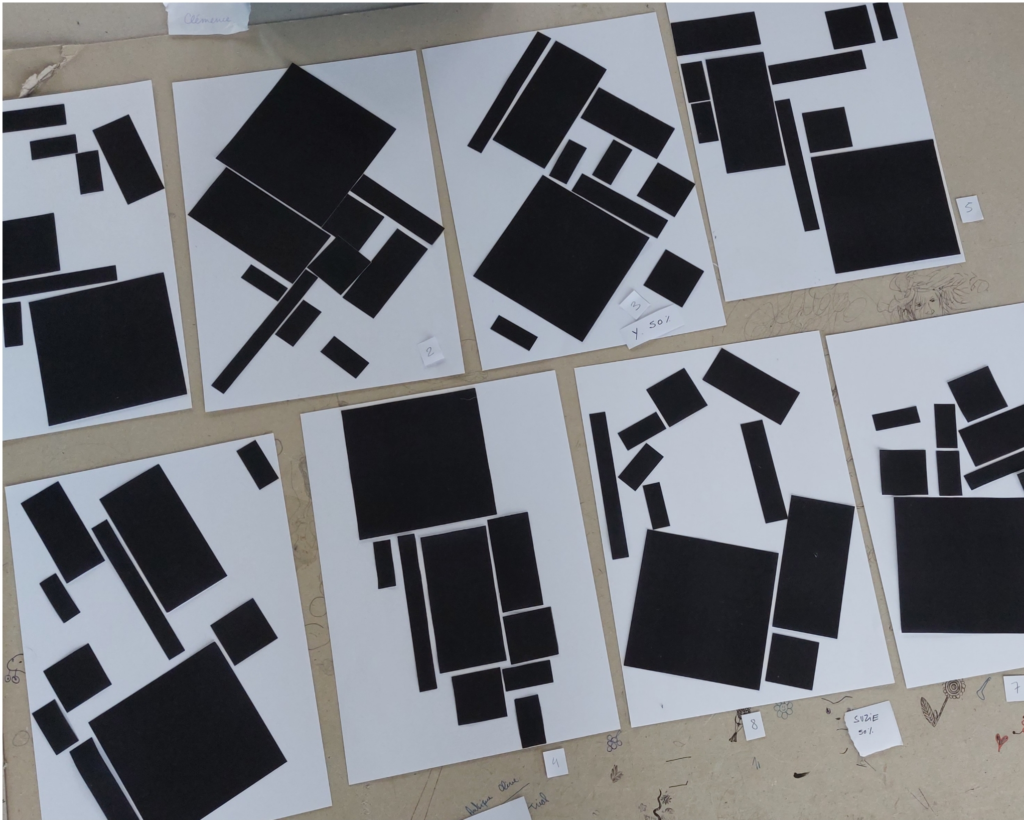 “Lors de cette séance, il a été question d’analyser diverses affiches jouant avec la typographie et l’agencement du texte dans l’espace. Les affiches de Pierre Neuman et de Michel Bierut en sont un parfait exemple, ainsi que les affiches pour Yale School of Architecture où la typographie n’est plus un simple texte mais une image également, dans le même esprit que le travail de Paula Scher. Ensuite, il a été question de s’entraîner à créer des compositions abstraites avec des carrés et rectangles noirs en les agençant dans un A4 tout en jouant sur les contrastes de forme, de taille et de proportion.”