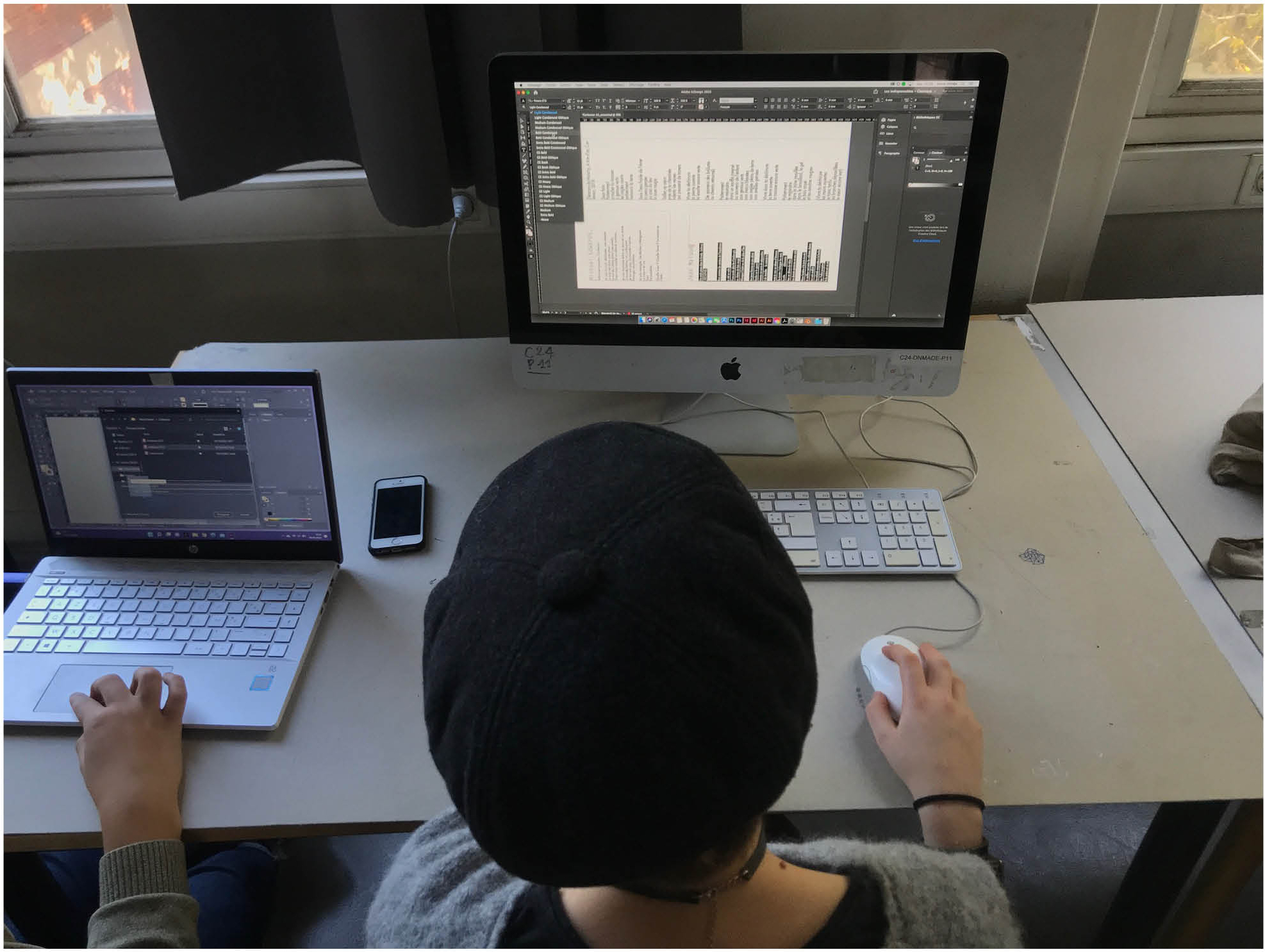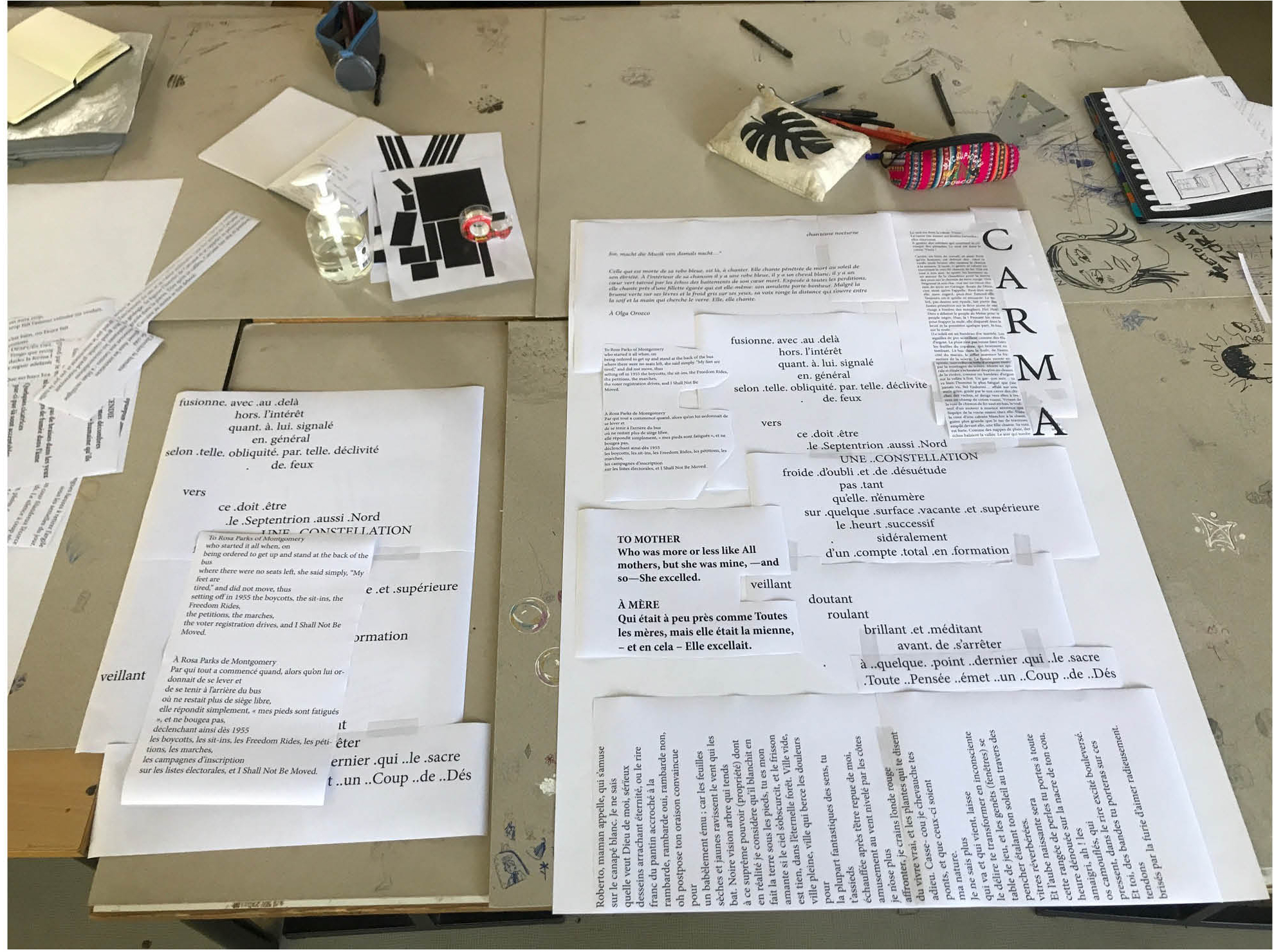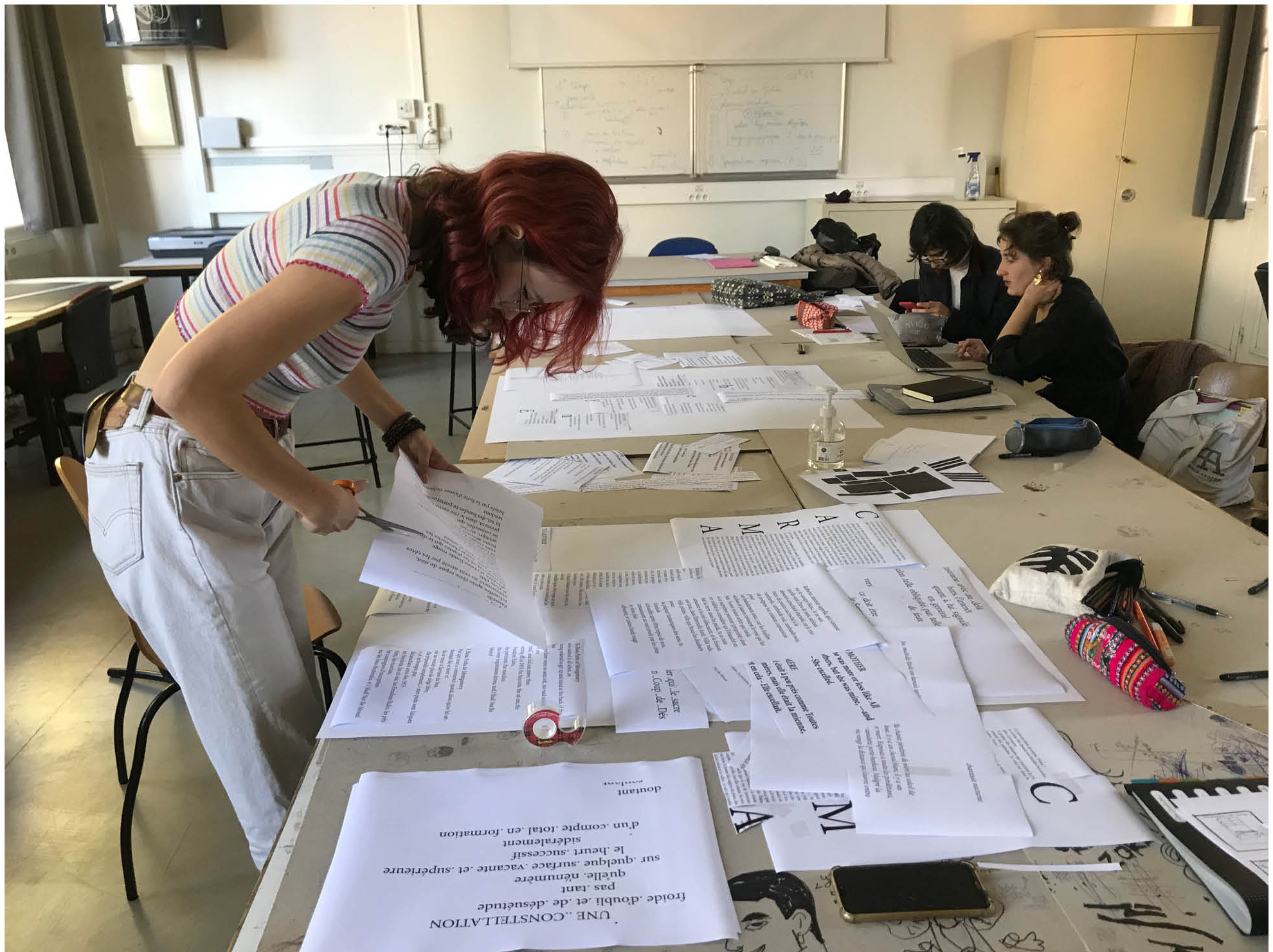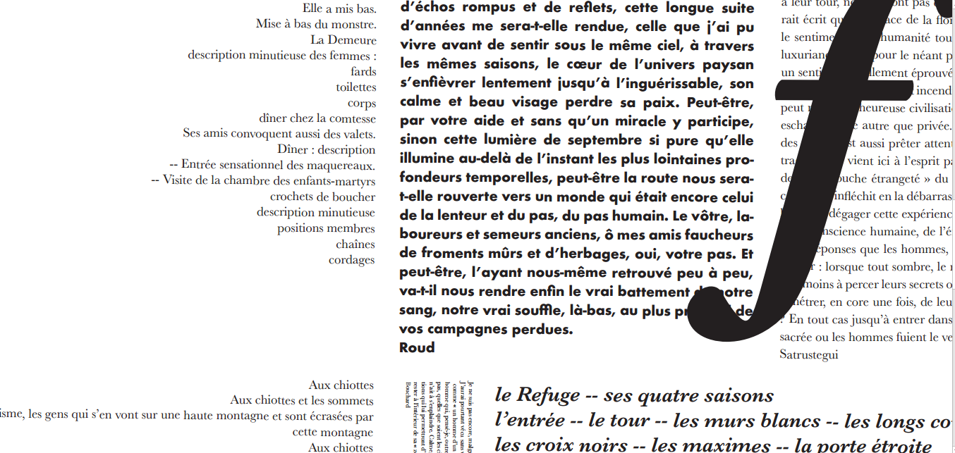 “Cette nouvelle séance a été consacrée à la poursuite des recherches de composition d'affiche. L'enjeu était d'expérimenter différents contrastes et texture de blocs de texte imprimés et de les disposer dans un espace 20% plus petit que le format A0 (format final). Il était aussi question d'explorer différents sens de lecture, de guider le regard à travers la page en jouant sur différentes échelles de corps typographiques. Ensuite, nous avons entamé un travail sur fichier numérique afin de mettre en forme les pistes dégagées.”
