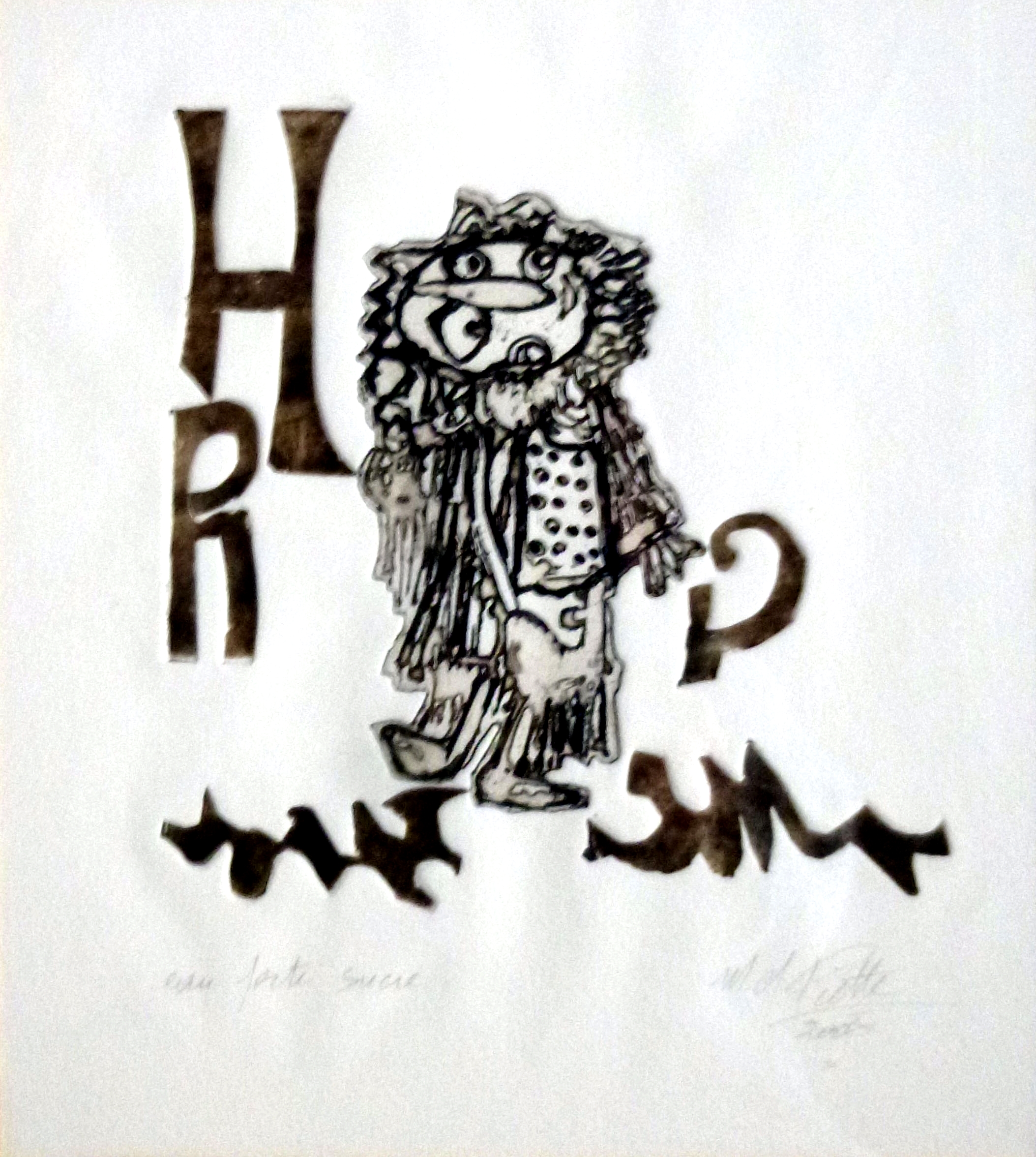 Technique : eau forte au sucre et linogravure en écriture