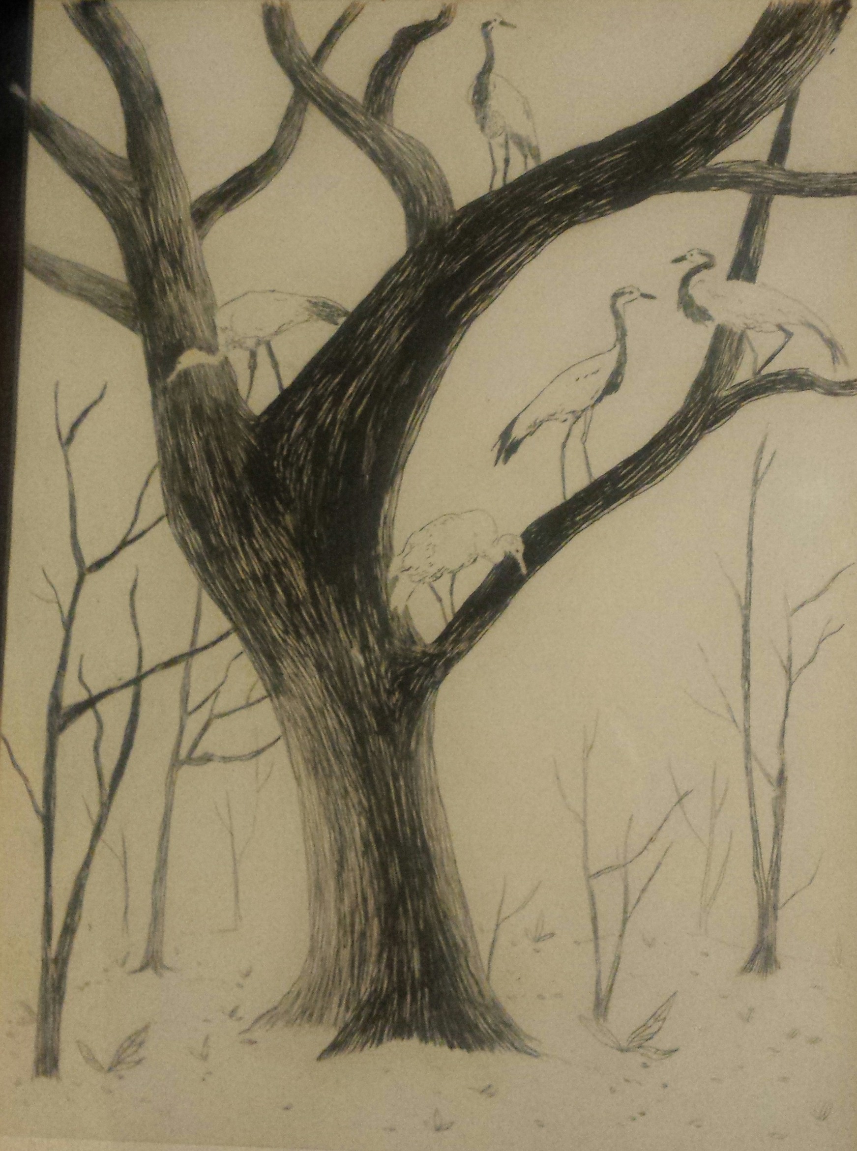 Grattée minutieusement sur rhodoïd, cette œuvre peut- être assimilée à un monotype. Le choix du motif, laissé à la discrétion de Victor Lejeune, doit peut-être être lu comme une évocation oblique de la migration, l'affût animal individuant chaque fois, par l'orientation propre des regards, l'étage des perspectives qui se projettent au loin, vers un lendemain de quelques instants, sur un socle dressé de branches s'élevant dans l'aridité de l'hiver.
