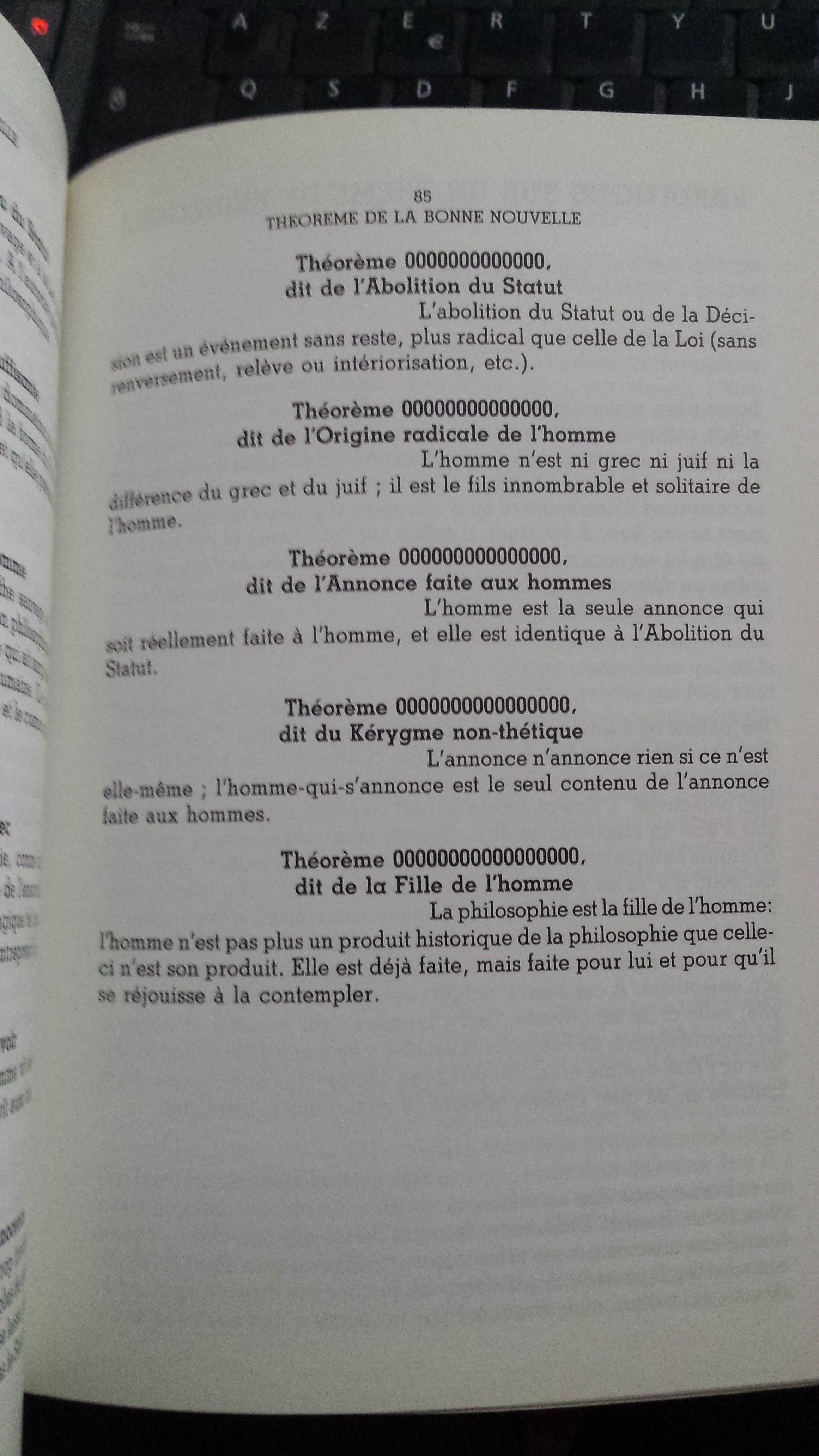 Texte goûté entre tous parmi les écrits expérimentaux qui ont participé à construire la Non-Philosophie, la Philosophie Non-Standard, ou comme on voudra bien l'appeler, cette pensée si virtuose de François Laruelle (1937- ), les Théorèmes de la Bonne nouvelle restent aujourd'hui encore difficiles à consulter, malgré leur réédition dans l'excellente anthologie traduite éditée chez Urbanomic, dont on souhaiterait l'exact équivalent en édition française.