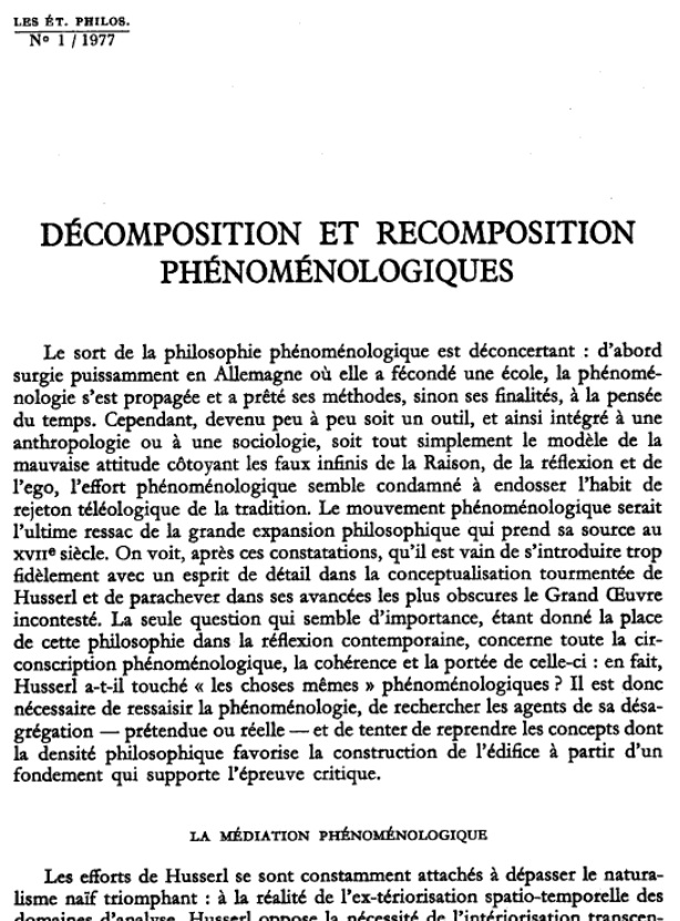 The fate of phenomenological philosophy is disconcerting: at first arising powerfully in Germany where it fecundated a school, phenomenology has propagated and lent its methods, if not its finalities, to the thought of the time. However, having gradually become either a tool, and thus integrated to an anthropology or a sociology, or simply the model of the bad attitude alongside the false infinities of Reason, of reflection and the ego, the phenomenological effort seems condemned to endorse the habit of a teleological offshoot of tradition. The phenomenological movement will be the ultimate backwash of the great philosophical expansion that takes its source from the 17th century. We see, after these findings, that it is vain to be too faithfully introduced, with a spirit of detail, into Husserl’s tormented conception and complete, in his most obscure advances, the uncontested Great Work. The only question that seems of importance, given the place of this philosophy in contemporary reflection, concerns all the phenomenological circumscription, its coherence and scope: in fact, did Husserl touch “the” phenomenological “things themselves”? It is thus necessary to reseize phenomenology, to find the agents of its disaggregation—alleged or real—and to attempt to retake the concepts whose philosophical density favors the construction of the edifice from a fundament that supports the critical test.